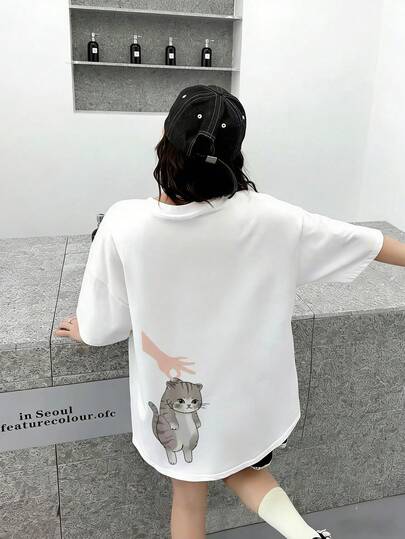 6. 女士宽松圆领短袖T恤,可爱猫咪印花,春夏休闲白色