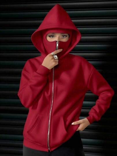 女士宽松拉链口袋卫衣,带口罩,适合秋冬季、万圣节、圣诞节等场合,时尚百搭,女士连帽卫衣 - 紅色 - 查看 1