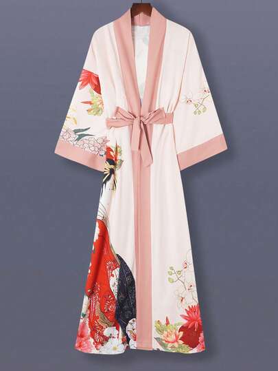 女士中长款和服睡袍,配腰带,开襟领,半袖,花卉印花 - 米色 - 查看 10