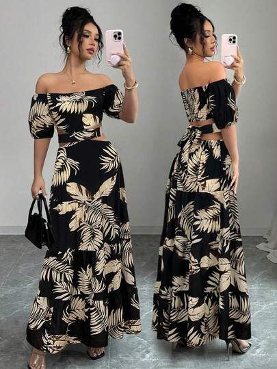 女士新款露肩系带镂空波西米亚不对称印花度假连衣裙 - 黑色 - 查看 1