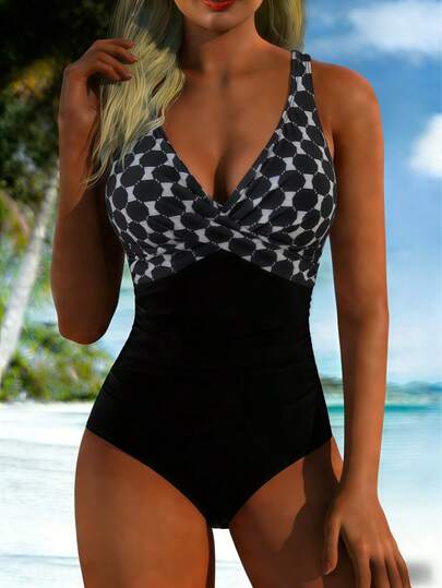 女士连体泳衣,收腹提臀,前交叉露背V领显瘦泳装,适合度假海滩穿着