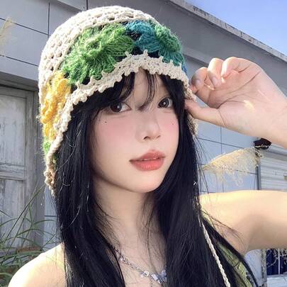 6. Women's Oversized Handmade Crochet Beanie Hat, Lightweight Breathable Hollow Out Knitted Hat With Tassel, Sweet Slouchy Design Cap For Summer Outdoor Activities