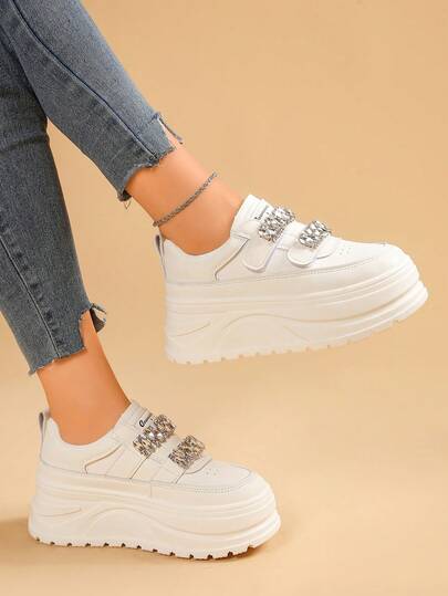 女式厚底坡跟运动鞋,新款水钻钩环休闲白鞋,学生百搭鞋 - 白色 - 查看 1