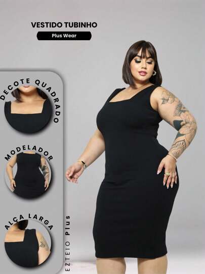 Women's Plus Size Sheath Dress With Square Neck And Square Straps - 黑色 - 查看 1