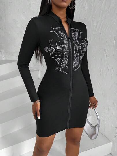 SHEIN Slayr 女式水鑽裝飾前拉鍊修身連身裙 - 黑色 - 查看 1