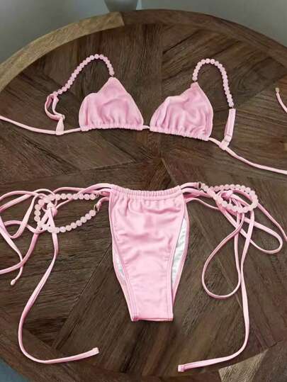 女士性感纯粉色比基尼泳衣,欧美风格,夏季 - 粉色 - 查看 1