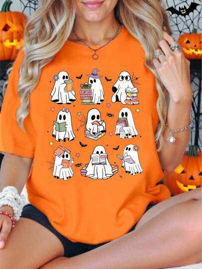 女式简约时尚休闲创意网格书形鬼魂图案印花圆领短袖 T 恤,万圣节