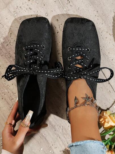 女士春秋新款黑色花卉印花系带方头轻便奢华时尚百搭走秀派对韩版休闲鞋平底秋季户外度假仙女复古法式简约平底乐福鞋 - 黑色 - 查看 1
