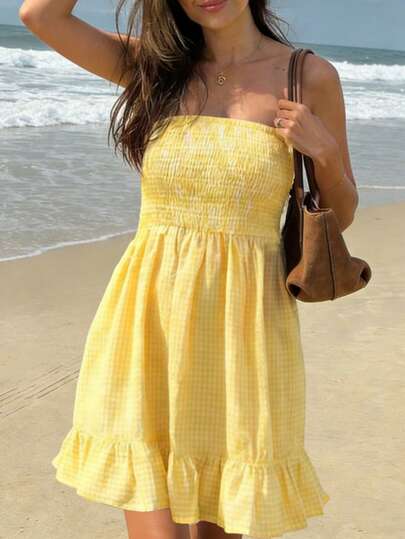 女士春夏新款时尚优雅休闲简约通勤度假街头风黄白格纹荷叶边露肩修身A字迷你连衣裙,开领设计。适合夏季度假装扮、休闲连衣裙、节日穿着及女士休闲服饰。 - 黃色 - 查看 1