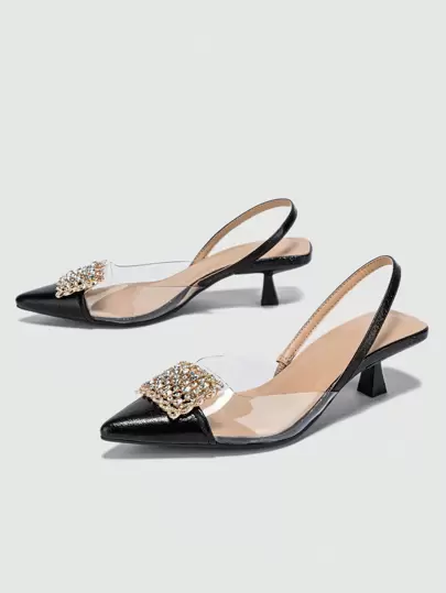 2025 秋冬女款春夏户外铆钉透明高跟鞋,尖头撞色设计,小猫跟鞋,优雅,女式浅口鞋 - 黑色 - 查看 1