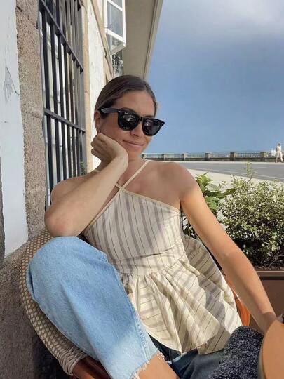 女士条纹吊带背心,荷叶边喇叭下摆和荷叶边细节,聚酯纤维,无弹力,常规长度