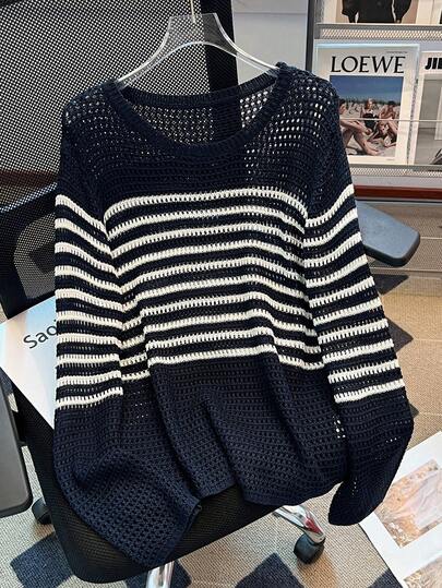 女士条纹休闲宽松针织套头毛衣,轻盈镂空优雅日常穿着,海滩度假风,宽松雪纺防晒上衣,夏季 - 藏蓝色 - 查看 1