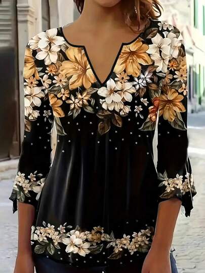 女款V領花卉A字型3/4袖上衣T恤 - 彩色 - 查看 1