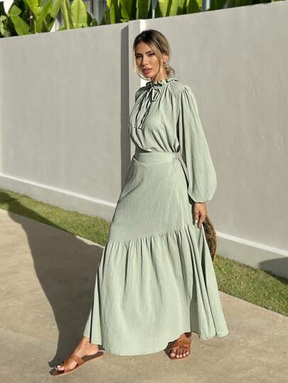 RueChic 綁帶領口長袖上衣,帶褶邊設計,優雅編織套裝,適用於夏季 - 薄荷綠 - 查看 1