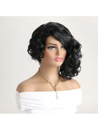 女士 14 英寸自然黑色短卷发合成假发,侧分设计,适合日常佩戴 - 黑色 - 查看 1