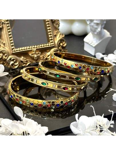 奢华复古18K彩色全钻几何金手链不锈钢开口款式适合女性日常聚会晚宴新娘婚礼宴会海滩度假佩戴 - 彩色 - 查看 1