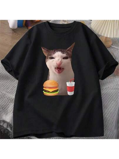 Cat Crunching Food Meme T-Shirt Women Silly T Shirts Funny Cat Eating T-Shirt Short Sleeve Graphic Tees Streetwear Womenclothing - 黑色 - 查看 4