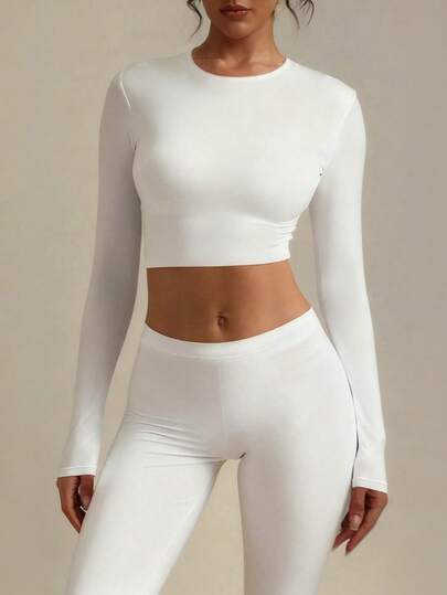 XLLAIS 小圆领长袖修身T恤,弹性双层设计,白色露脐上衣,秋冬服装 - 白色 - 查看 1