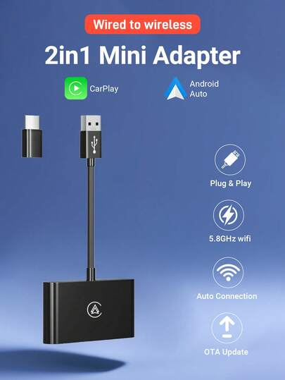 XUDA 2025 新款迷你 Carplay Ai 盒子有线转无线二合一适配器 CarPlay 和 Android Auto 稳定传输适用于 99% 原装车带有线 CarPlay/Android Auto 2.4~5.0 GHz WiFi5 - 黑 - 查看 1