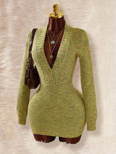 Amplova 秋冬休闲长袖深V领修身女式毛衣裙 - 彩色 - 查看 1