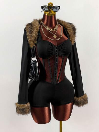Amplova 女士网眼拼接透视紧身衣,性感毛茸茸拼接长袖,适合日常穿着,约会,新年,纯色拼接皮草时尚服装,秋冬