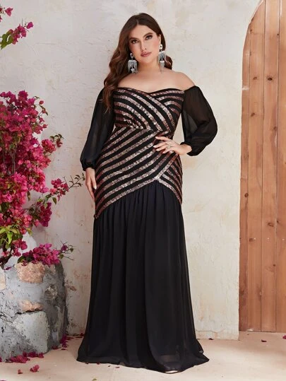 YISIKADO 大碼一字肩亮片拼接正式連衣裙 - 黑色 - 查看 1