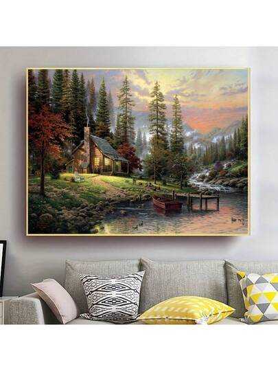 Lake Forest Wooden House Landscape Wall Art - Canvas Poster-1 Pc Wooden Framed Canvas Painting -  Thickness 2.25cm/0.9inch,Valentine's Day Decorations At Home,Valentine's Day,New Year,Home Gift Decoration, Room Decoration Aesthetic, Wall Decoration Art, Perfect Gift, Autumn And Winter Wall Decoration, Living Room Decoration, Bedroom Decoration, Kitchen Decoration, Entry Decoration, Bathroom Decoration, Direct Wall Painting, High Quality Wall Painting Poster ,Easter  Easter Decorations For Women - 彩色 - 查看 8