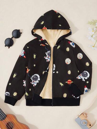 OIPOIG 秋冬季年轻男孩休闲连帽保暖夹克,带有宇宙元素印花 - 黑色 - 查看 1