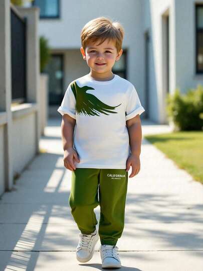 年輕男孩鷹印花上衣和字母印花慢跑褲套裝 - 軍綠色 - 查看 1