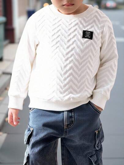 男童休闲舒适多功能波浪纹理面料圆领保暖加厚卫衣,校服 - 白色 - 查看 1