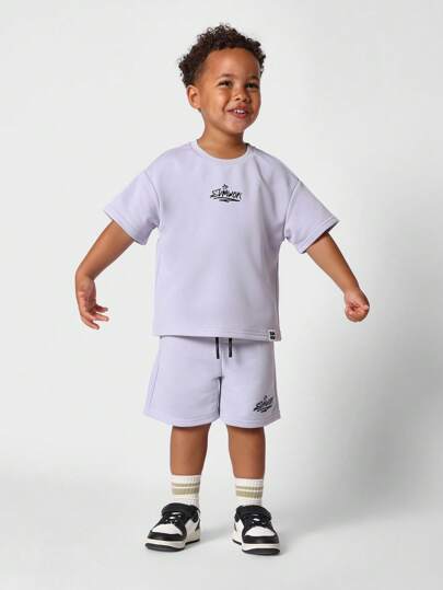 Sumwon 儿童夏季两件套运动短袖T恤和短裤套装休闲日常幼儿游戏套装松紧腰运动服 - 淡紫色 - 查看 1