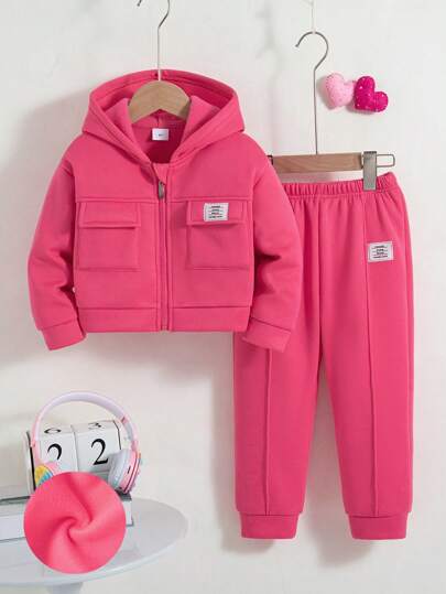 年轻女孩 2 件套休闲连帽拉链长袖夹克和羊毛裤套装,冬季 - 玫紅色 - 查看 1