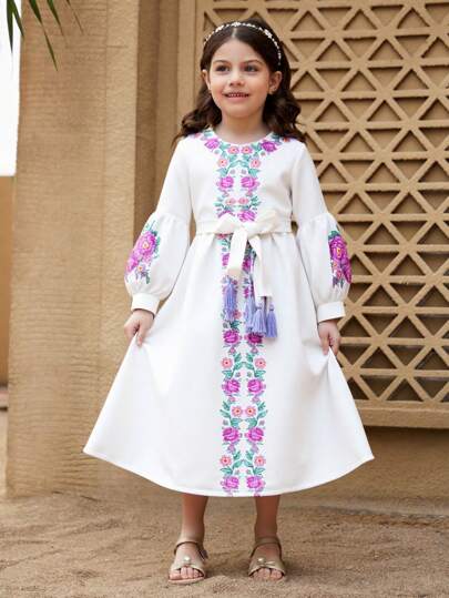 年轻女孩 Abaya Kaftan Jalabiya 束腰外衣,土著保守服装,玫瑰复古印花,假日休闲时尚腰带流苏吊坠连衣裙 - 紫色 - 查看 1