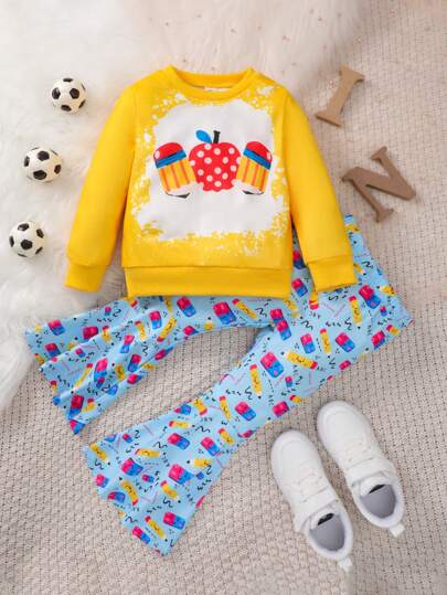 SHEIN 女小童卡通圖案運動衫&喇叭褲 - 黃色 - 查看 1