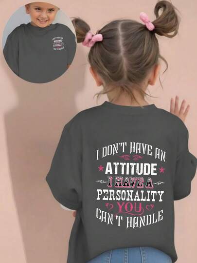 女童休闲印花圆领短袖T恤,夏季上衣 - 深灰色 - 查看 1