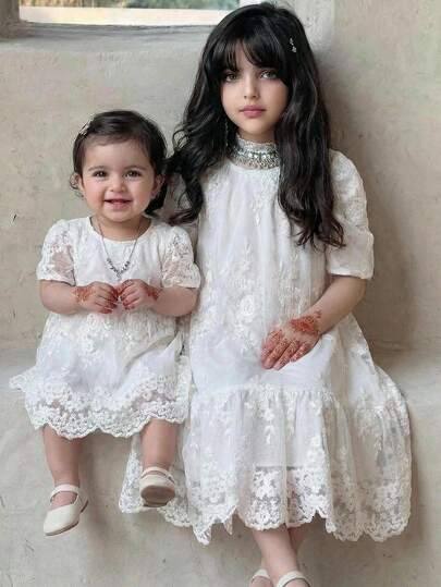 女童优雅蕾丝网纱刺绣泡泡袖宽松A字娃娃裙,女童拼接荷叶边下摆休闲连衣裙,白色,适合日常、婚礼、派对、假日、花童等场合