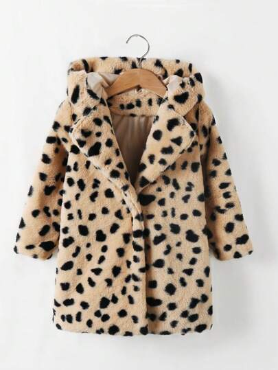 年轻女孩时尚超大连帽领长袖豹纹蓬松中长夹克,秋冬 - 卡其色 - 查看 1