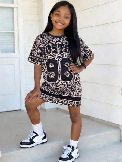 年轻女孩时尚街头圆领数字印花连衣裙,玫瑰红和黑色