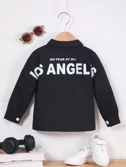 SHEIN 女小童字母圖案前紐扣夾克 - 黑色 - 查看 1