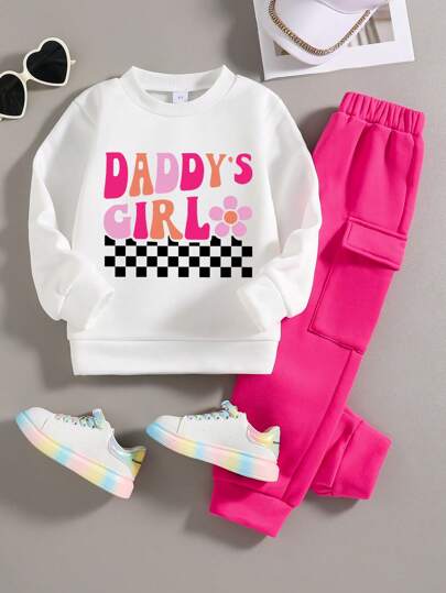 年轻女孩字母图案印花圆领长袖运动衫和纯色口袋运动裤套装,适合圣诞节 - 粉色 - 查看 1