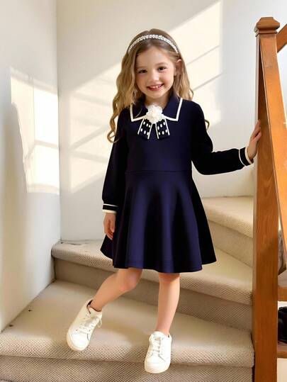 年轻女孩甜美可爱秋冬新款优雅珍珠花朵系腰针织连衣裙,适合度假穿着 - 藏蓝色 - 查看 1