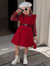 Elladie kids 年轻女孩复古红色格子长袖连衣裙,红色圆领罗纹无袖荷叶边下摆侧开衩连衣裙,两件套带腰带装饰,英伦风格,适合日常穿着和上学,秋季