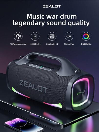 ZEALOT S79 Wireless Speaker 100W Power Outdoor Portable Subwoofer RGB Color Light Wireless Speaker, 24000mAh Battery, 8 Hours Of Gaming Time, Stereo Sound Effects, Compatible With SD Card/USB/AUX/Supports Serial Connection, Supports Mobile Phones/Tablets/TVs/Computers, Suitable For Outdoor/Indoor/Beach/Gatherings