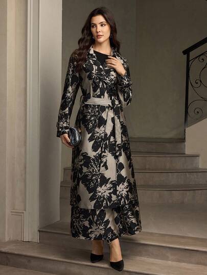 ZEYLAH 女士花卉提花面料翻领长袖优雅风衣 - 黑與白 - 查看 1