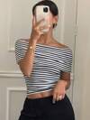 Livesso 夏季条纹露肩修身短袖女式T恤、短款上衣