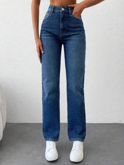 EURMUSE 拉鏈門襟直筒牛仔褲 - 深色水洗藍 - 查看 1