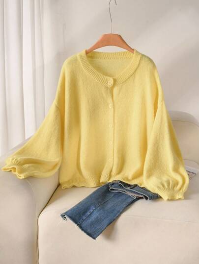 CosyJoli 大码休闲宽松基本款黄色圆领开衫 - 黃色 - 查看 1