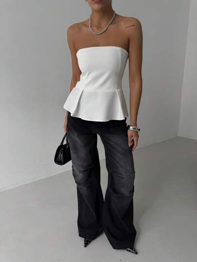 黑色时尚纯色优雅休闲拉链荷叶边下摆抹胸 - 白色 - 查看 1