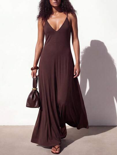 Zivah 2026春夏新品音乐节、复活节、圣帕特里克节、情人节、约会、西部风、游牧风、生日派对、毕业典礼、大学、学生、日常休闲、基础款、休闲、度假、邮轮、海滩、日光浴、爆款、街头风、婚礼宾客波西米亚风、通勤、早午餐、机场、派对、假日郊游、办公着装棕色无袖V领修身A字长裙