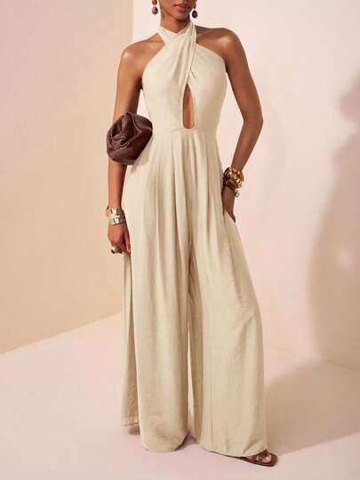 Zivah 2025夏季新款音乐节复活节母亲节婚礼生日派对日常出游基础百搭休闲度假邮轮旅行沙滩海边日光浴网红爆款街头风优雅通勤商务休闲深V领挂脖交叉绑带性感露背百褶宽松阔腿裤女连体裤